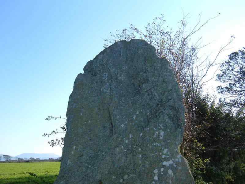 This impressive ancient monument is worth a visit – believe me! From Brynsiencyn take the A4080 towards Newborough. On the left-hand side of the road you will come to a layby with a CADW sign for Castell Bryn Gwyn. I believe that if I had walked back a little to the direction I came from then I would have come to a stile that offers slightly easier access to the stones. However, what I did was to go to the Castell Bryn Gwyn site. From there I crossed the ancient site, and looking to my left I saw a farm. I crossed the field and over a farm gate. Turning into the farmyard I came to a stile over a wall. I crossed it and keeping to the right-hand fence I soon arrived at the site of these spectacular stones, which in fact form part of the fence.