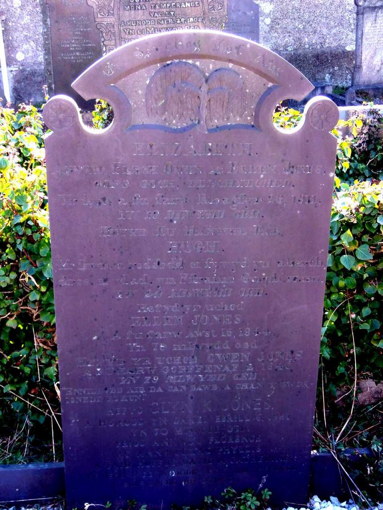 Hugh Jones died 1917 aged 24. Hugh – a Private in the Royal Welsh Fusiliers – had been killed in France but is remembered on the gravestone of his younger sister – Elizabeth – who had died aged just 10 in 1911, and their mother and father, Ellen who died in 1944, and Hugh, who died in 1946.