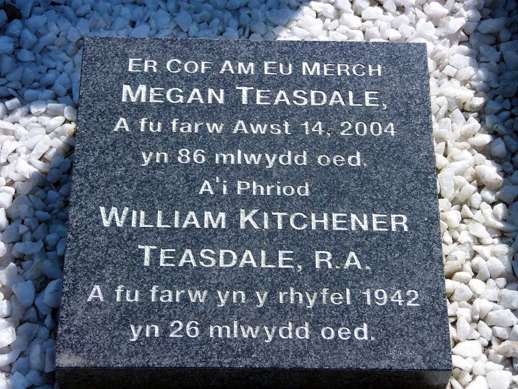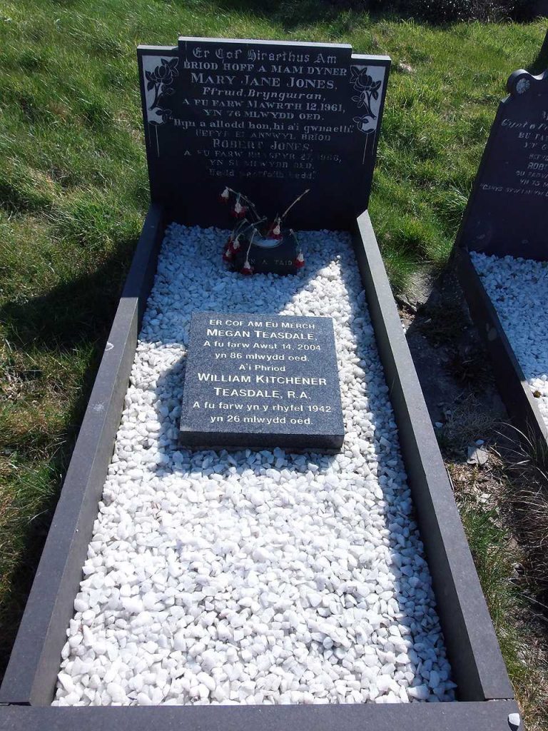 WWII War Casualty, William Kitchener Teasdale – a Gunner in the Royal Artillery – died on the 9th of March 1942 aged 26. A plaque on the grave of his in-laws remembers William and his wife Megan. Although William and Megan had married and lived in Sunderland, Megan was a Bryngwran girl. He is not listed on the Bryngwran War Memorial.