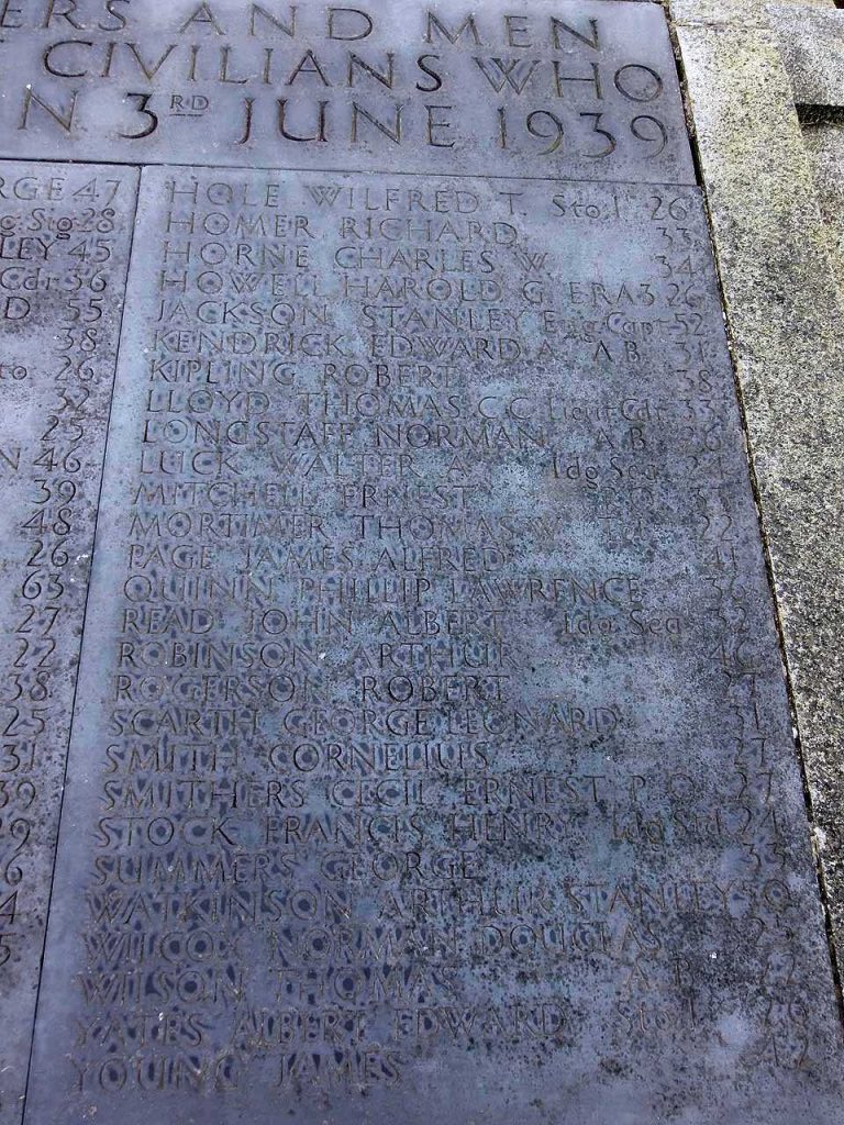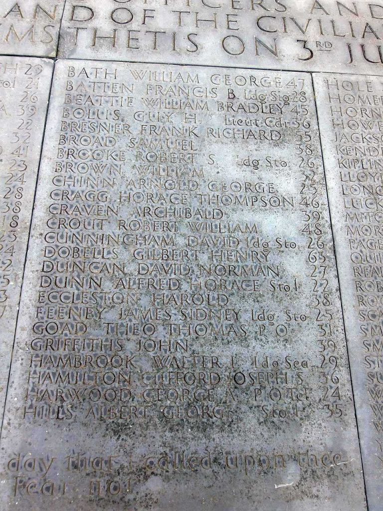 Nowhere on the internet have I found a complete list of the casualties, so I am putting the following table here, which I believe to be a true record of those lost. The only anomaly in my list is that I have two casualties with the surname Smithers, the one in the table with no age does not appear on the memorial. I have nevertheless left it in as I must have had the name from somewhere during my research – maybe the name was omitted from the memorial only for it to be realised later that he was in fact on board? I have arranged the names in alphabetical order for your convenience.