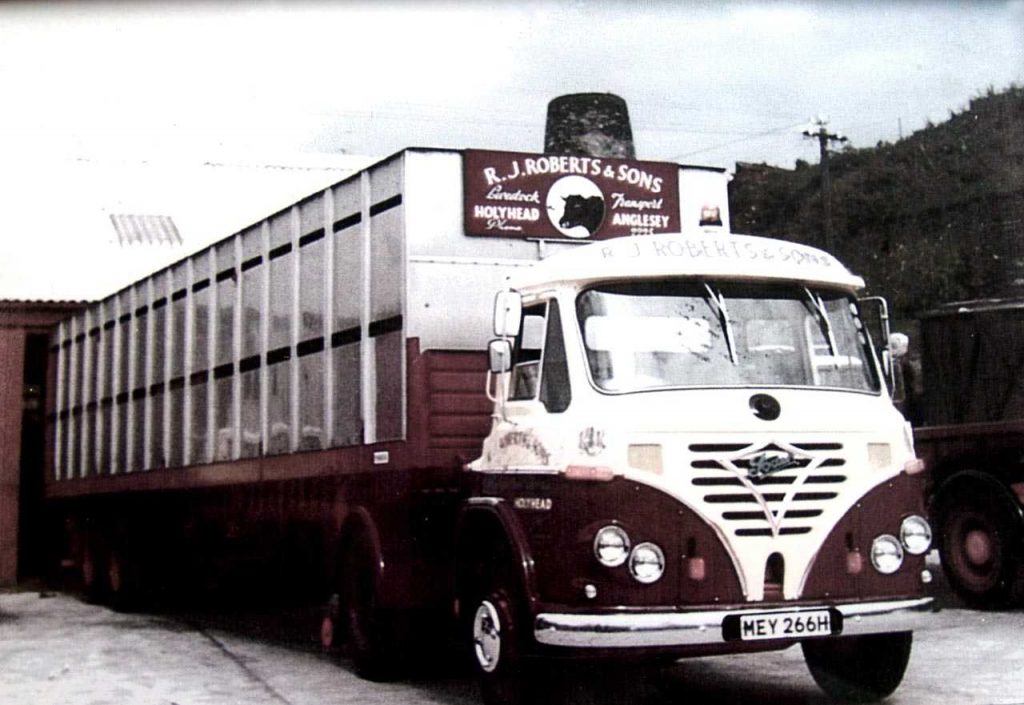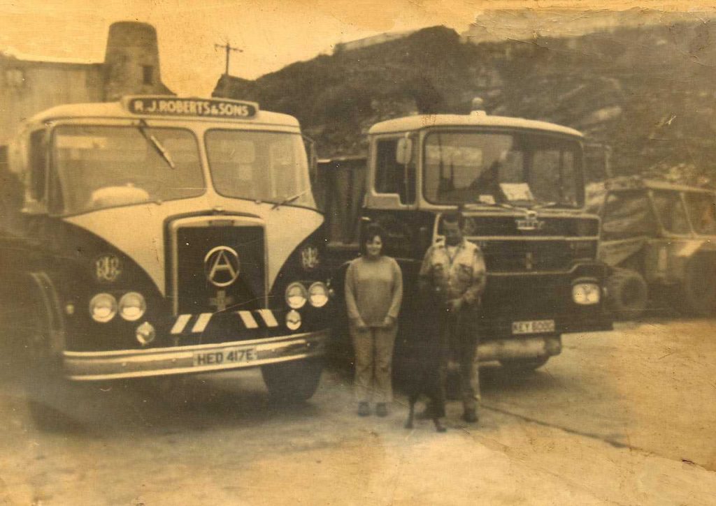 Anglesey, Holyhead, R.J. Roberts & Sons Haulage, John and Liz Roberts with Melin Tan Refail Windmill in the background the early 1970s.