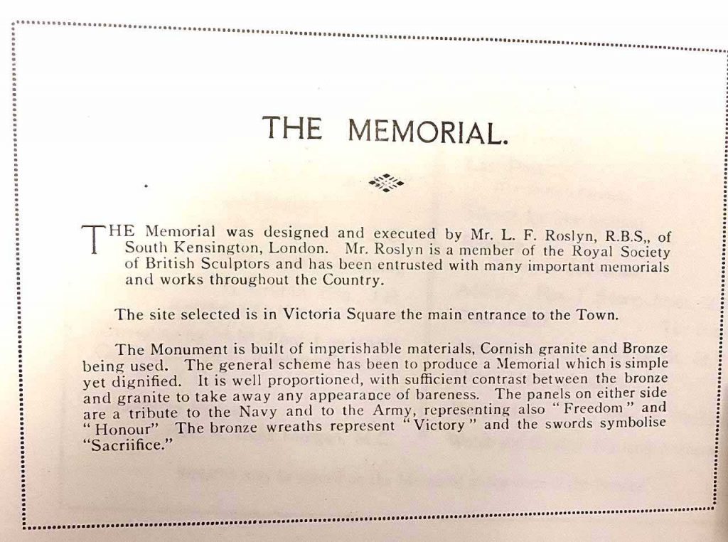 The Sculptor was Louis Frederick Roslyn, who had sculpted several other war memorials, and he was an ex-serviceman, having served in the Royal Flying Corps during World War One.