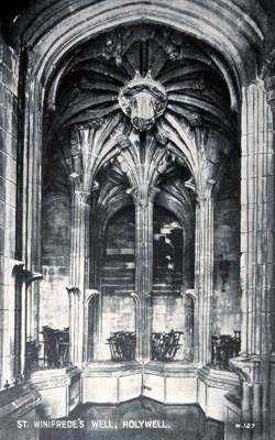Holywell in North Wales derives its name from the holy well of St Winefride’s (real name Gwenfrewi – a Welsh Nun in the 7th century. Her being was since proved from historical facts). The water from the well is said to possess miraculous healing powers, and people have travelled thousands of miles just to bathe in the waters. A church has stood on the same spot as the existing church since the 11th century, and probably since the time of Winefride. Holywell is known as the Lourdes of Wales.
