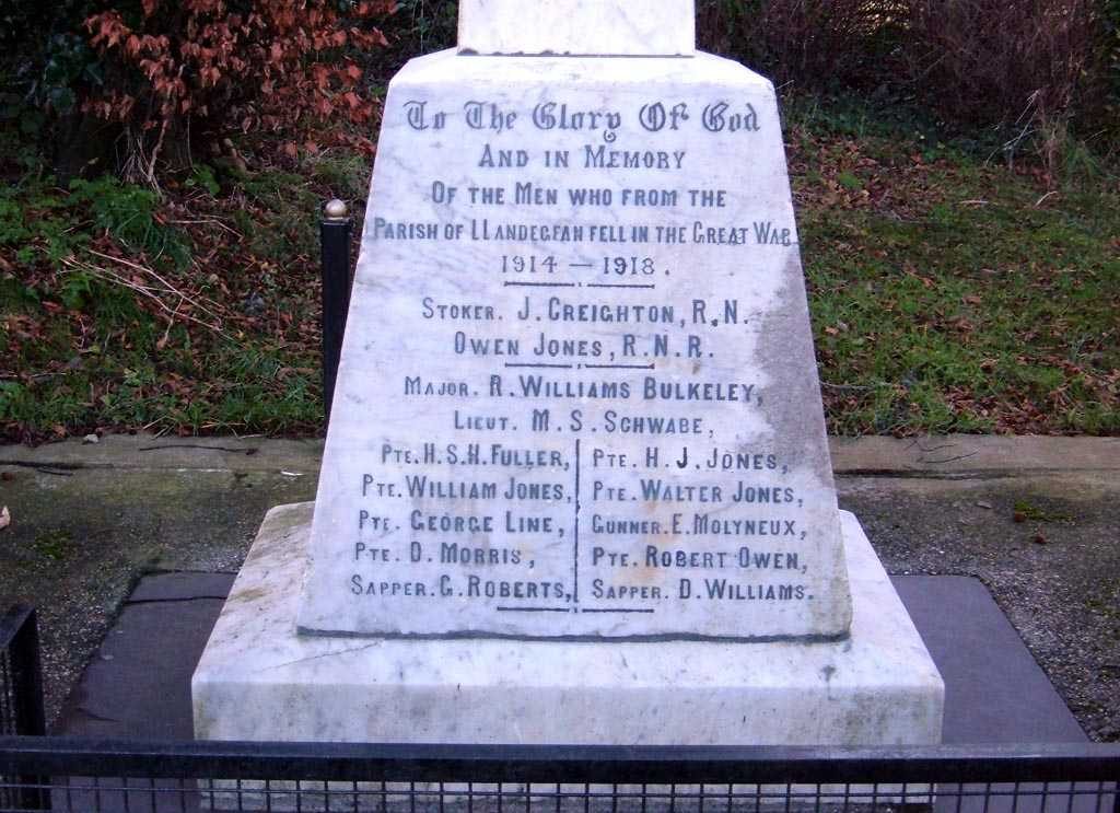 In Llandegfan on the Island of Anglesey in North Wales, the fallen of two world wars are remembered on a memorial outside the Parish Hall, and also inside St Tegfan’s Church.