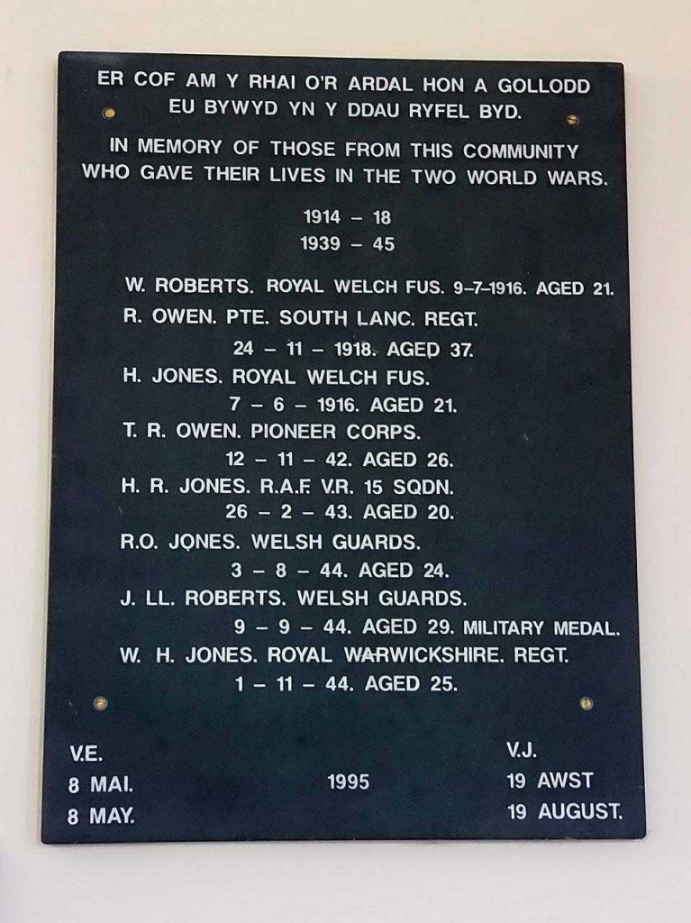 The War Memorials are located in the village hall, and cover Llanfachraeth, Llanfaethlu, Llanfwrog and Llanynghenedl.