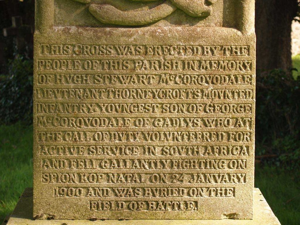 Llansadwrn is in a rural location on the Island of Anglesey in North Wales. In the grounds outside Llansadwrn Church is an enormous Celtic Cross, erected to the memory of Lieutenant Hugh Stewart McCorquodale of the Thornycroft’s Mounted Infantry Regiment, and paid for by subscriptions from the local people.