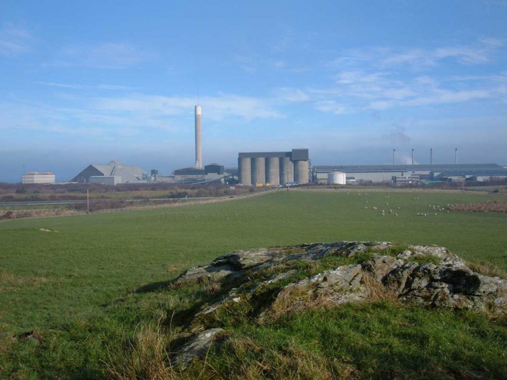 Trefignath burial chamber view of Anglesey Aluminium